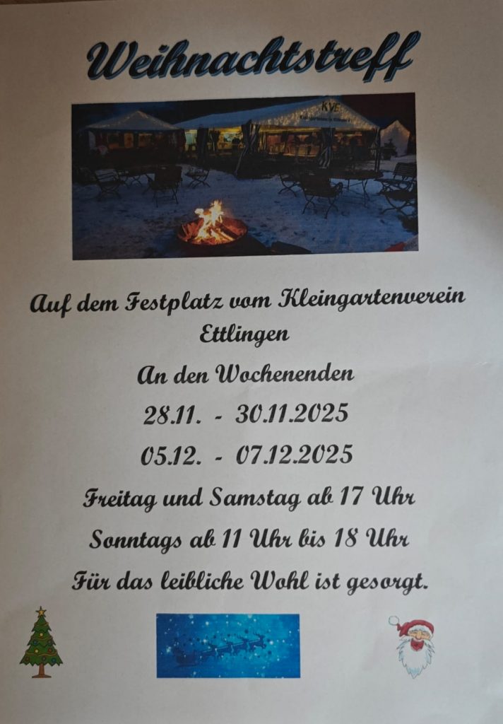 An den Wochenenden vom 28. – 30.11 und vom 5. – 7.12 findet wieder unser Weihnachtstreff statt. Freuen Sie sich auf ein vorweihnachtliches Beisammensein mit Glühwein, Bratwurst, Kürbissuppe und einigem mehr. Freitags und samstags verkaufen die KJG Liebfrauen und die Schreberjugend Ettlingen leckere Waffeln.